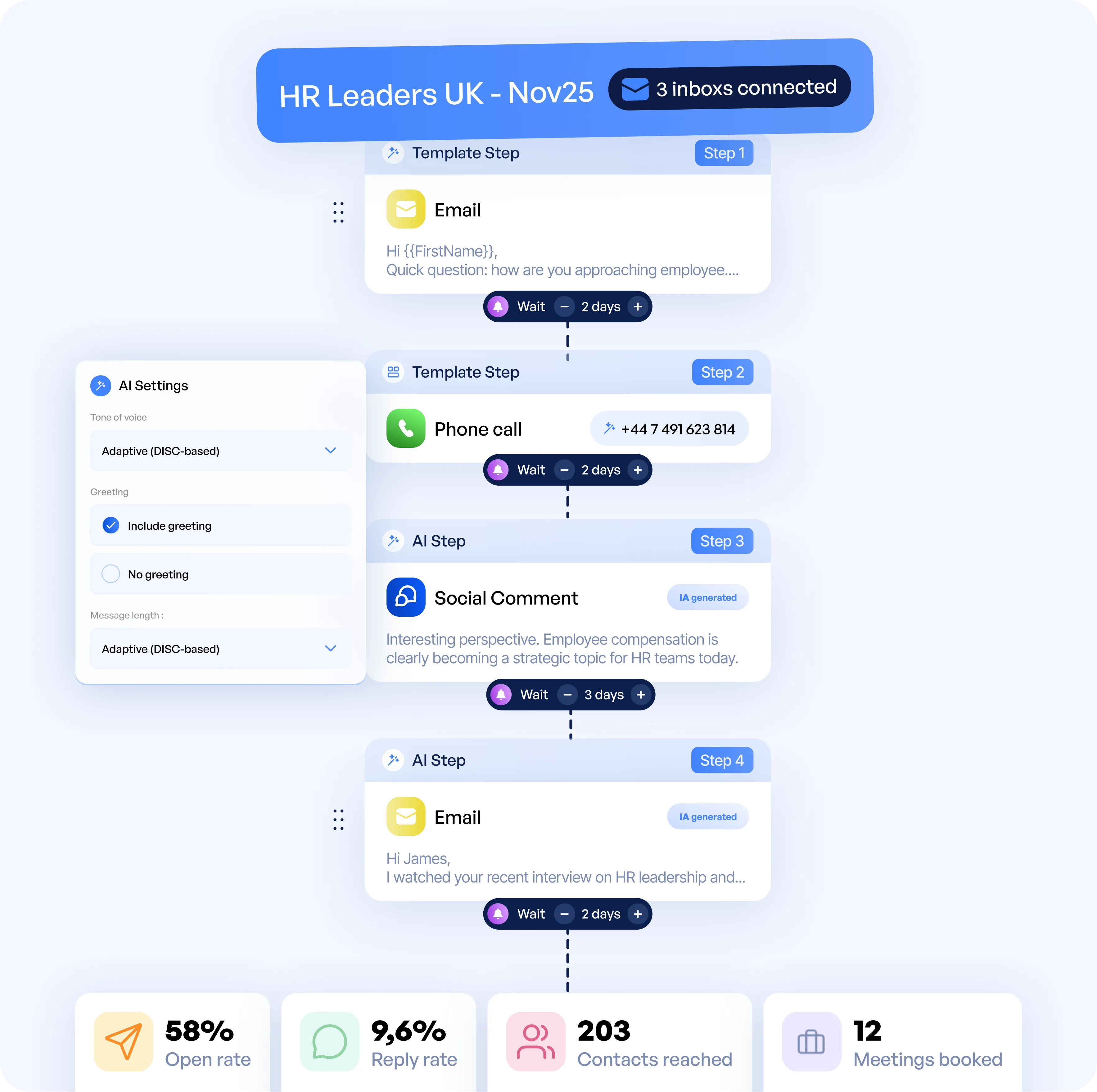 Find the right contacts, enrich emails and phone numbers, automate outreach and let AI analyze responses and performance.