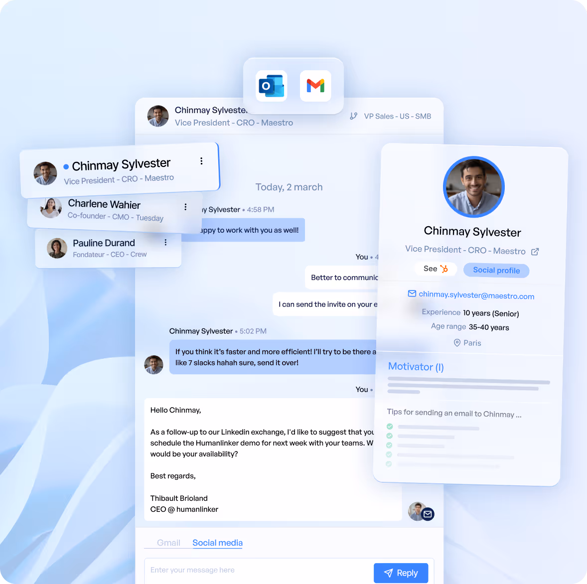 Centralize all your Socials and Email conversations. Humanlinker Inbox groups all messages by leads on one screen, saving you time and ensuring you never miss an opportunity, even during absences.