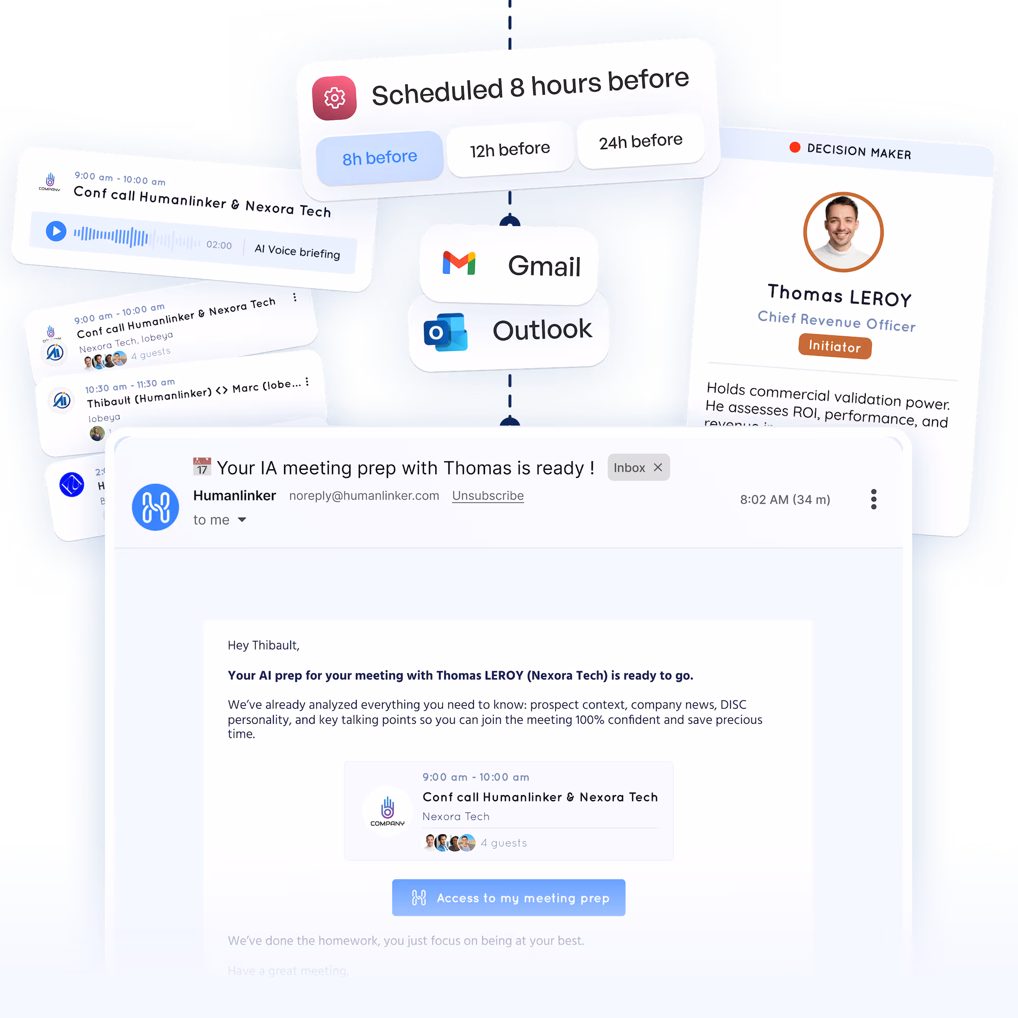 Always be ready: get an email alert a few hours before every meeting and access your prep instantly. No more improvised meetings.